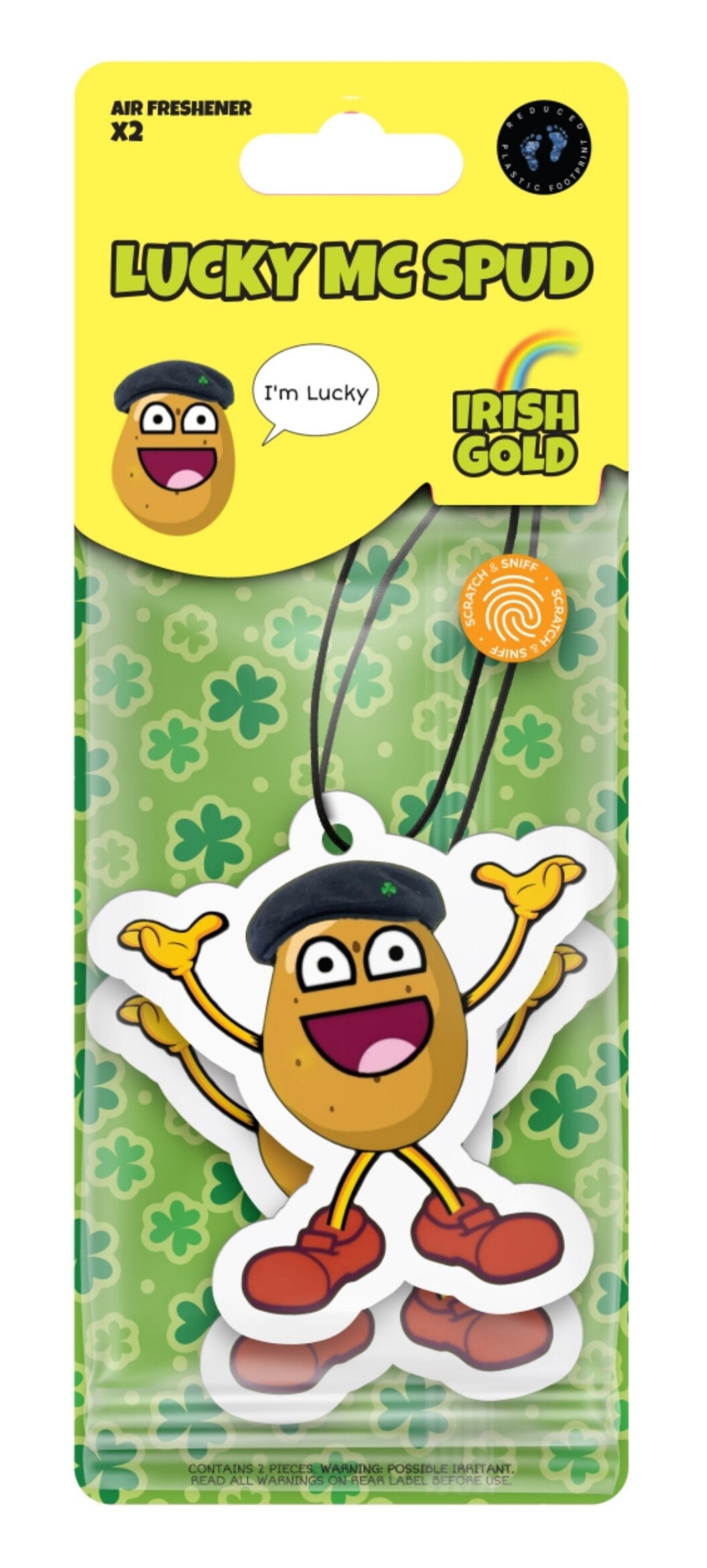 Lucky McSpud is your fun and unique Irish designed air freshener, experience our refreshing Irish Gold scent that will leave your car smelling amazing. Lucky McSpud comes in a twin pack to bring you twice the Irish luck!